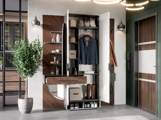- Секция шкафа: вверху полка для шляп, под ней справа выдвижная штанга-вешалка для плечиков, слева вертикальная перегородка с двумя полками для мелких предметов, внизу ниша за одной распашной дверью
