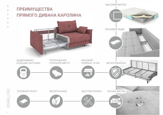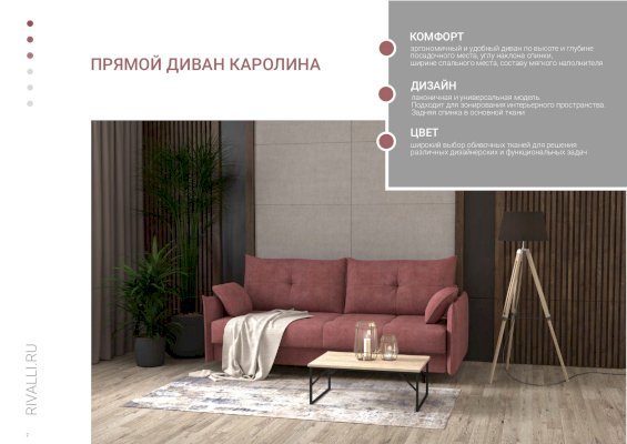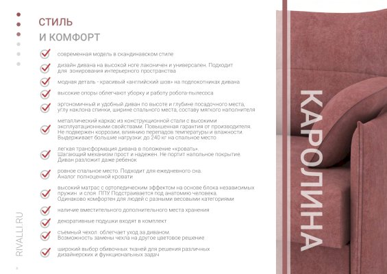 Диван Каролина - современная модель в скандинавском стиле. Отличительной особенностью модели является красивый «английский шов» на подлокотниках дивана. Высокие опоры придают дивану легкости и облегчают процесс уборки: клиренс 10 см позволяет свободно маневрировать роботу-пылесосу. Дополнительное преимущество - задняя спинка в основной ткани, что дает возможность размещать диван не только у стены, но и в любом месте помещения. Особую прочность дивану придает металлический каркас из конструкционной стали, а простой и надежный механизм трансформации - пантограф - обеспечивает долгий срок службы.