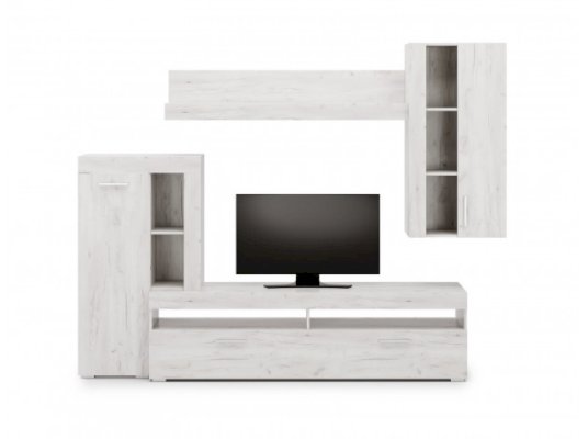 Состав композиции: настенная полка (ВхШхГ): 1499 х 300 х 268 мм; навесной шкаф (ВхШхГ): 1200 х 601 х 440 мм; напольный шкаф (ВхШхГ): 1351 х 800 х 440 мм; ТВ-тумба (ВхШхГ): 514 х 200 х 440 мм. Размер ниши под ТВ (ВхШ): 1099 х 1119.
