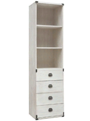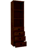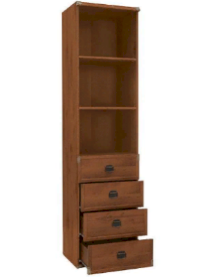 Шкаф разделен на 2 отделения: верхнее –открытое отделение с полками, нижнее – 4 выдвижных ящика на металлических роликовых направляющих