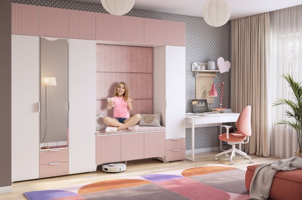 Шкаф изготовлен из прочного материала – лдсп белого дерева, а фасады выполнены из качественного мдф с использованием эмали цвета пудра розовая, добавляющей бархатистость и нежность. Вертикальные полосы на фасаде создают эффектный акцент с использованием фрезеровки.