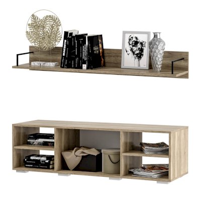 Стильная и очень вместительная комбинация из тумбы под ТВ и полки Наоми является частью одноимённой модульной серии. Модель выполнена из качественной ЛДСП в цвете дуб каньон, а фасад одного из ящиков отделан МДФ другого цвета. На столешнице тумбы поместится телевизор практически любого размера, а в нишах можно хранить необходимую технику. Навесная полка станет прекрасным решением для размещения предметов декора, книг или рамок с фотографиями.