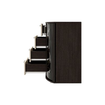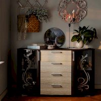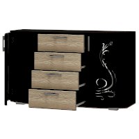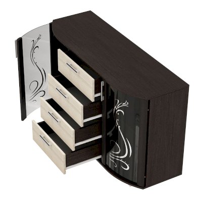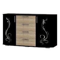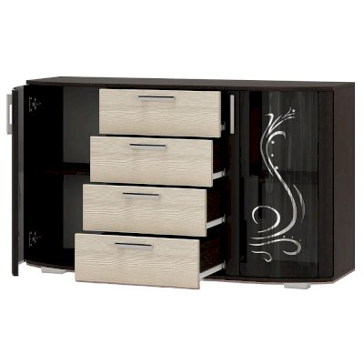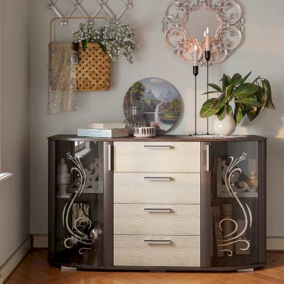 Комод Грация может стать центром внимания любой комнаты в вашей квартире или доме. Помимо четырех выдвижных ящиков, с обеих сторон модель оснащена двумя распашными стеклянными створками, за которыми расположены полки для хранения вещей. На столешнице комода Грация можно разместить фотографии или, например, вазу с цветами. Светлые фасады выдвижных ящиков цвета лоредо прекрасно сочетаются с орнаментом на тонированных стеклянных дверцах.