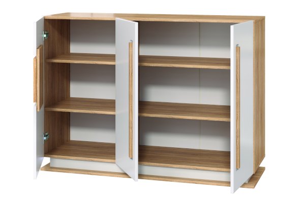 У комода комбинированные глухие фасады, которые крепятся на петли без доводчиков. Внутри-два отделения с полками. Полки изготовлены из ЛДСП цвета Дуб Сонома и выдерживают нагрузку до 5 кг каждая.