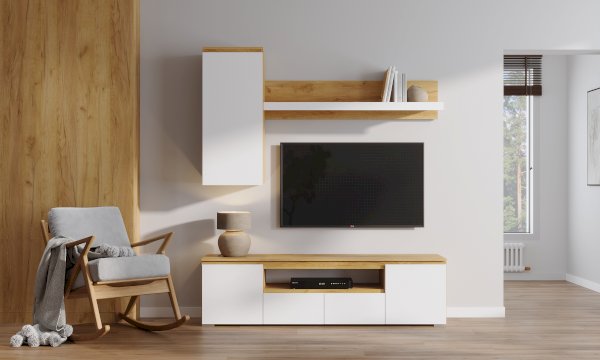 Применение интегрированной ручки на фасадах делает модель стильной и безопасной – дверцы и ящик открываются за профилированные выступы. Фасады обработаны кромкой 1 мм. Черная регулируемая ножка-опора.