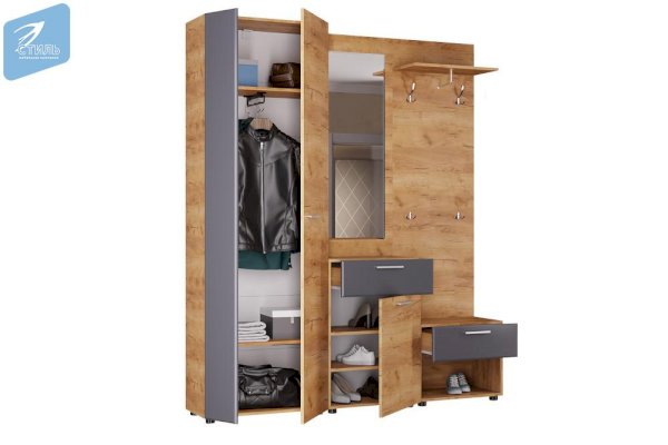 Модульная прихожая Сафари выполнена в современном выдержанном европейском стиле. Прихожая обладает элегантным дизайном, сочетающим изысканность цвета и фактур корпуса и фасадов яркого «Дуб Крафт золотой» и мягкого «Графит СОФТ».