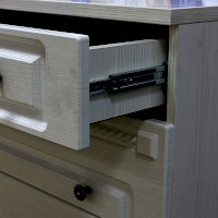 Фурнитура: ручки металлические со стразами, петли с доводчиками, в качестве опор (ножек) использованы пластмассовые подпятники. Шариковые направляющие.