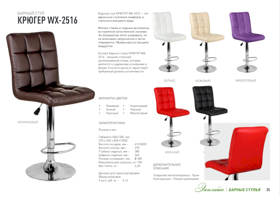 Барный стул КРЮГЕР WX-2516 со спинкой непременно придется вам по вкусу и создает в кафе неповторимую атмосферу. Основа барного стула КРЮГЕР WX-2516 - мощная стальная хромированная опора, которая крепится к надежному основанию в форме плоского диска и гарантирует требуемый уровень устойчивости. Мягкие формы сидения и стеганой спинки обеспечат посетителю комфорт.