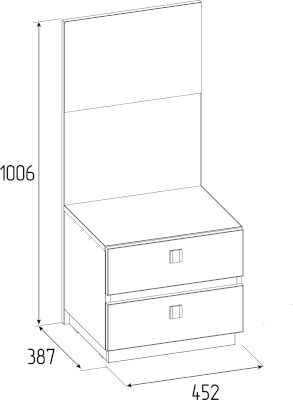 Прикроватная тумба NEO 41 с двумя выдвижными ящиками и высокой мягкой спинкой – красивый и функциональный модуль. Изюминка тумбы - комбинированная задняя стенка, возвышающаяся над столешницей: ее нижняя часть из ЛДСП, а верхняя с подушечкой из экокожи цвета Асфальт. Когда тумба приставлена к кровати, тогда она составляет единую композицию с изголовьем. Дополняют тумбу интересные ручки на ящиках: в обычном состоянии - это плоские прямоугольные кнопки, а при необходимости выдвинуть ящик средняя часть приподнимается кончиками пальцев.