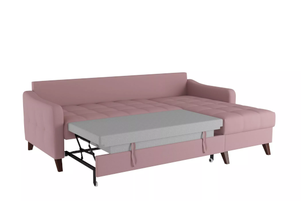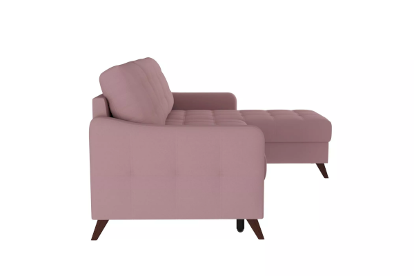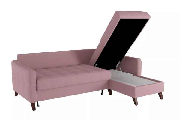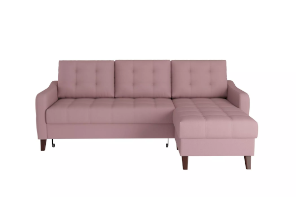 Модель с универсальным углом подойдет любителям часто менять обстановку. Для такой мебели легко найти новое место и изменить при этом всю планировку комнаты. Внутри корпуса располагается вместительный ящик для хранения. Устойчивые и высокие ножки с имитацией дерева придают дивану легкость и изящество. Высота опор позволяет с легкостью проводить уборку роботом-пылесосом.