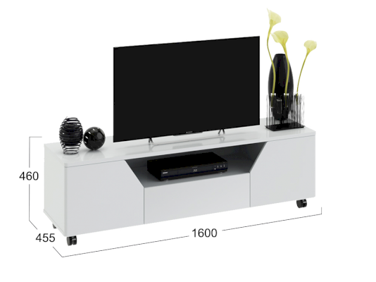 Тумба ТВ оснащена открытой нишей для техники, выдвижным ящиком, закрытыми секциями и широкой поверхностью подставки под телевизор. Отличительной чертой тумбы является отсутствие лицевой фурнитуры, что позволяет открывать ее с помощью захвата фасада рукой.