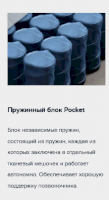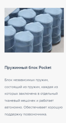 Матрас сделан на основе блока независимых пружин Pocket, плотностью 500 пружин на спальное место, снимает нагрузку с позвоночника и качественно поддерживает область поясницы. Современный гипоаллергенный материал Foam придает комфорт. Чехол матраса изготовлен из практичного и дышащего хлопкового жаккарда.