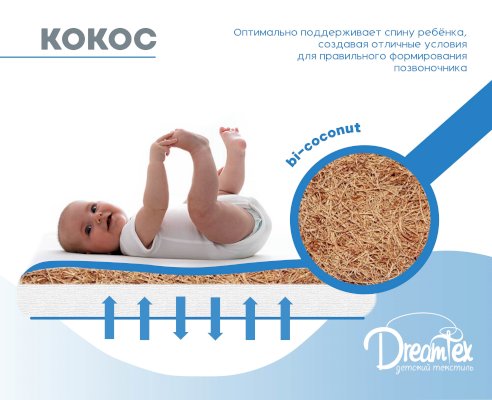 Идеально подходит для большой трансформации кроватки Dreams Smart. Двухслойный матрас позволяет регулировать жесткость спального места для вашего малыша, а натуральные материалы (кокос) создадут оптимальный ортопедический эффект от эксплуатации. Кокосовая койра – качественный, натуральный, износостойкий материал, используемый в матрасном производстве в качестве жесткого наполнителя.