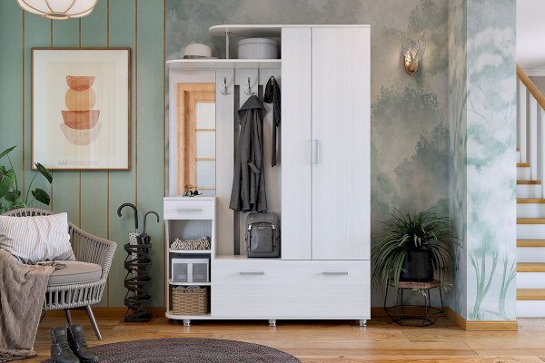 Прихожая «Барселона-2» обладает испанским характером – она стильная и добродушная. Вы можете разместить одежду в шкафу с выдвижной штангой или на вешалке с крючками, обувь сложить в нижний шкаф, шляпки на специальную верхнюю полку, а мелочи в выдвижной ящик и открытые полки. Есть зеркало.
