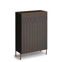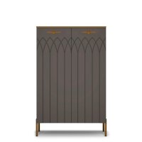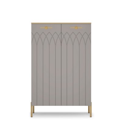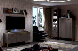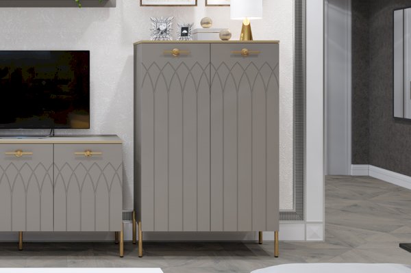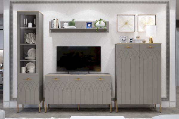 • Применение фасадов МДФ – гарантия долгой службы мебели. Поверхность фасадов soft touch с фрезеровкой – невероятно практичное и красивое решение в современном дизайне мебели. Украшают шкаф металлическая фурнитура и золотая кромка.