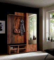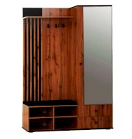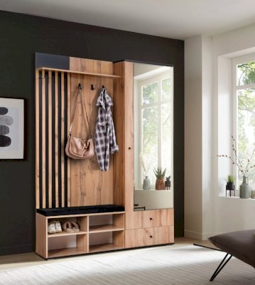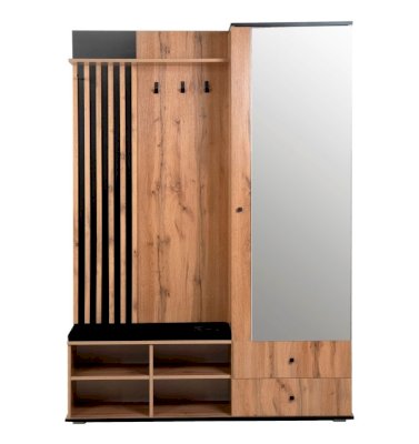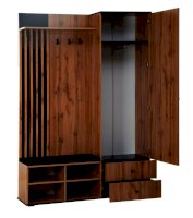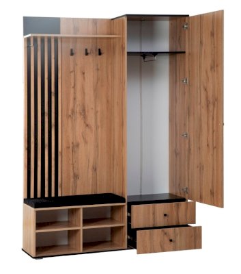 В шкафу есть открытая секция с тремя металлическими крючками, чтобы повесить верхнюю одежду. Ниже предусмотрен мягкий элемент, чтобы можно было присесть и снять обувь или просто поставить сумку. В закрытой секции - выдвижная штанга и шляпная полка. Выдвижная штанга выдерживает вес до 16 кг. Снизу предусмотрены два вместительных выдвижных ящика с шариковыми направляющими. Ящики можно использовать для хранения обуви и обувных аксессуаров.