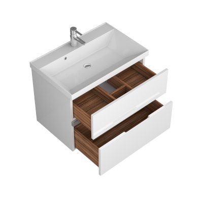Тумба выполнена из влагостойкого материала, покрытие лакокрасочное. Пятислойное нанесение эмали с лаковым покрытием обеспечивает надежную защиту изделия от влаги. Подвесная тумба с 2 выдвижными ящиками, оборудованными доводчиками скрытого монтажа плавного закрывания. Верхний ящик-органайзер с системой разделения, что обеспечивает грамотное распределение ванных принадлежностей. Ручка изготовлена по спец.заказу, позволяет комфортное открывание и закрывание ящиков.