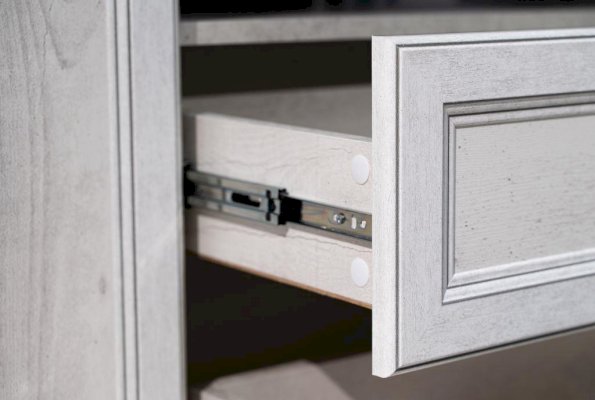 Комбинированный шкаф-витрина – это не только удобно, функционально, но еще и очень красиво. Такая модель – мечта любой хозяйки. Прозрачные дверцы-витрины в обрамлении рамочной фасадной конструкции превращают шкаф в настоящую картину, которой можно любоваться. Наполнение зависит от ваших желаний, целей и задач. Чаще всего в таких шкафах располагают посуду, которую хочется продемонстрировать – и себе, и гостям. Внутри находятся четыре полки: три стеклянные, и одна из ЛДСП – самая нижняя, которая одновременно является перегородкой и отделяет верхний отсек от нижнего - с двумя выдвижными ящиками. Тонкое закаленное стекло полок очень прочное, несмотря на свой хрупкий внешний вид – каждая полка выдерживает до 3 кг. И только нижняя, из ЛДСП – до 5 кг – поэтому на нее можно поставить посуду потяжелее. Этот шкаф также будет отлично смотреться в кабинете. Научные труды или художественная литература, выставленная на полках, скажут и сами за себя и охарактеризуют своего хозяина с самой выгодной стороны – как личность неординарную и интеллектуальную. Кстати, если вы коллекционер, то в таком шкафу будут прекрасно выглядеть ваши коллекции – от спортивных кубков до моделей кораблей. Два нижних выдвижных ящика находятся один над другим. Благодаря современным технологиям дверцам и выдвижным ящикам не нужны доводчики – они легко и дружелюбно распахиваются и выдвигаются навстречу  по первому желанию хозяев. Шариковые направляющие обеспечивают очень плавный ход.