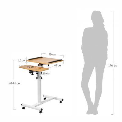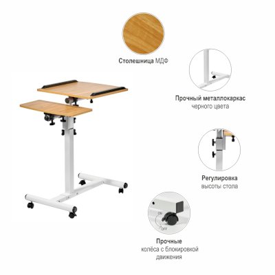 Столик оборудован поворотной столешницей из МДФ, состоящей из двух  независимых частей,  и металлическим основанием. Угол поворота столешницы составляет 180°, вплоть до вертикального положения. Высота подъема регулируется в диапазоне от 62 до 96 см. На столешнице имеются ограничители для ноутбука, планшета, предотвращающие падение гаджета.