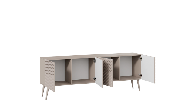 Тумба под ТВ обладает геометрическим силуэтом и привлекательной цветовой палитрой, превращая новинку в стильный модуль, который прекрасно дополнит современный интерьер гостиной.