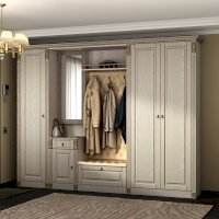 Прихожая выполнена в классическом стиле с декоративными элементами. Фасады и декоративные элементы патинированы, патина наносится вручную, по классической итальянской технологии и защищена матовым лаком. Мягкие элементы (вешалка и сиденье) выполнены из экокожи, декорированы каретной стяжкой.