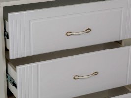 Модульная серия «Виктория» выполнена в стиле «Классика». Особенность серии - фасады МДФ с фрезеровкой, петли с доводчиком на всех фасадах, шариковые направляющие, ручки металлические с белой вставкой, покрытие золото.