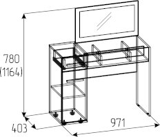 Простой с виду туалетный столик из коллекции Норвуд обладает интересной конструкцией. Откидная контрастная крышка стола скрывает нишу с органайзером для хранения мелких аксессуаров. На внутренней стороне крышки - зеркало, перед которым удобно наносить макияж и проводить косметические процедуры. Сбоку – отделение с полками за распашной дверцей и выдвижным ящиком, фасад которого выполнен из ЛДСП цвета Орех Шоколадный. Закрытый столик можно использовать для работы на ноутбуке или с документами. Модуль можно собирать как на левую, так и на правую сторону.